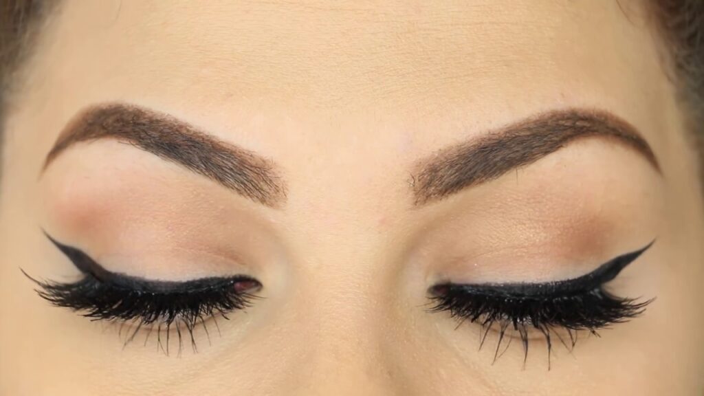 Este look se basa en un delineado intenso y alargado, combinado con sombras de ojos en tonos neutros y pestañas postizas dramáticas.