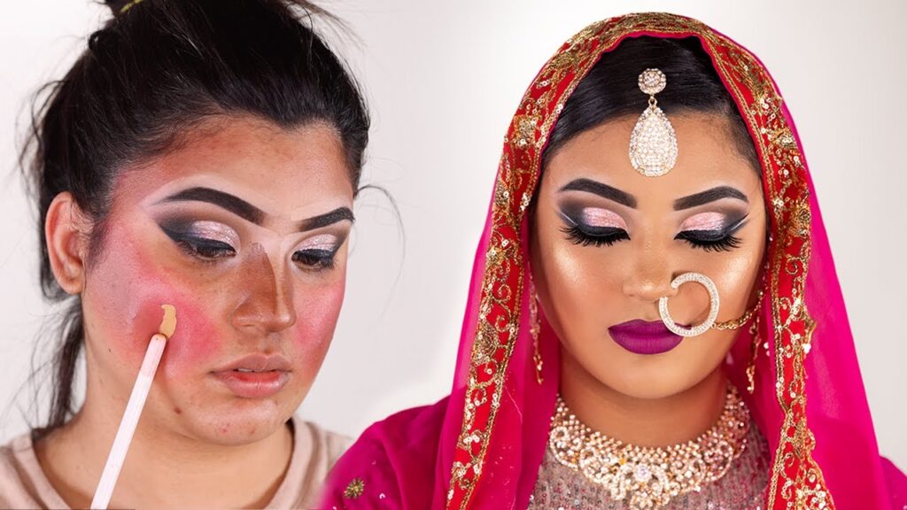 La base de maquillaje es fundamental para lograr un aspecto uniforme y sin imperfecciones en el maquillaje hindú árabe. Elige una base de maquillaje que se adapte a tu tipo de Belleza y tono. Aplica la base en todo el rostro, difuminándola suavemente hacia el cuello para evitar líneas de demarcación.