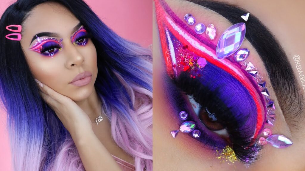 Para un look de arcoíris azul, aplica sombras azules en los párpados y combínalas con sombras de otros colores para crear un efecto arcoíris. Utiliza delineador de ojos azul para dar definición y añade brillo en el lagrimal. Completa el look con labios brillantes en tonos azules o naranjas.